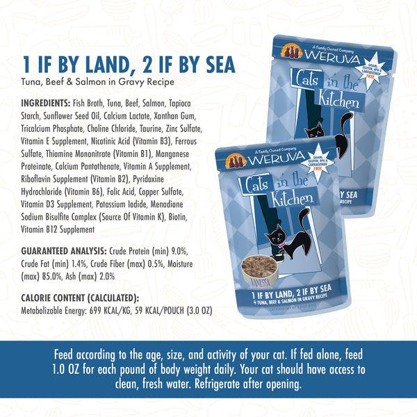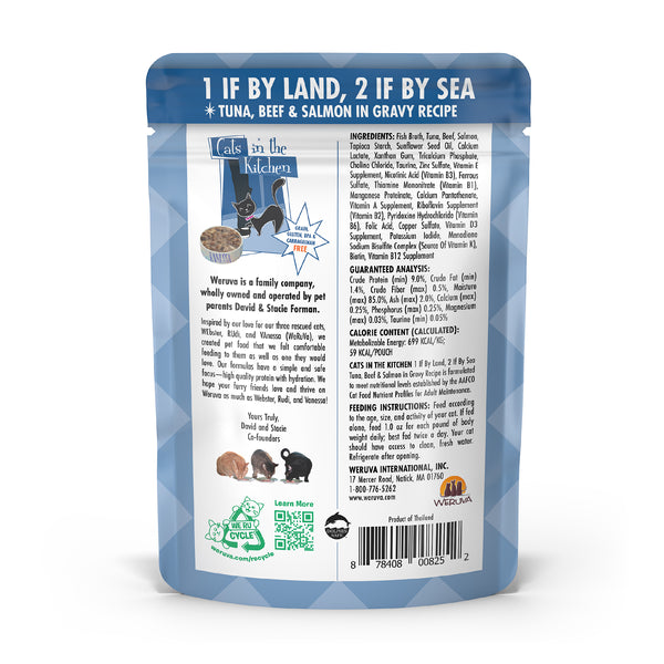 Fish Broth, Tuna, Beef, Salmon, Tapioca Starch, Sunflower Seed Oil, Calcium Lactate, Xanthan Gum, Tricalcium Phosphate, Choline Chloride, Taurine, Zinc Sulfate, Vitamin E Supplement, Nicotinic Acid (Vitamin B3), Ferrous Sulfate, Thiamine Mononitrate (Vitamin B1), Manganese Proteinate, Calcium Pantothenate, Vitamin A Supplement, Riboflavin Supplement (Vitamin B2), Pyridoxine Hydrochloride (Vitamin B6), Folic Acid, Copper Sulfate, Vitamin D3 Supplement, Potassium Iodide, Menadione Sodium Bisulfite Complex (Source Of Vitamin K), Biotin, Vitamin B12 Supplement.