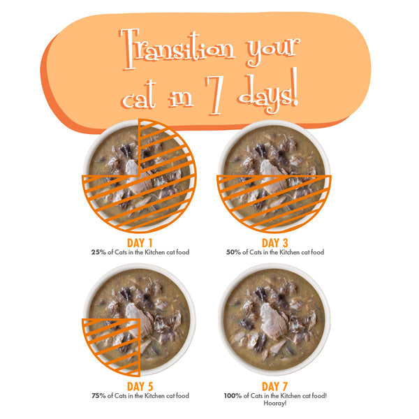 Despite how much your feline friends ask for Weruva's high-quality foods, it's best to transition them gradually onto a new food over a week. Start by mixing a small amount of Weruva in with their old food and slowly increase the amount of Weruva fed over 7 days. This will help your kitty to adjust to their new Weruva foods – Because WeLuvya
