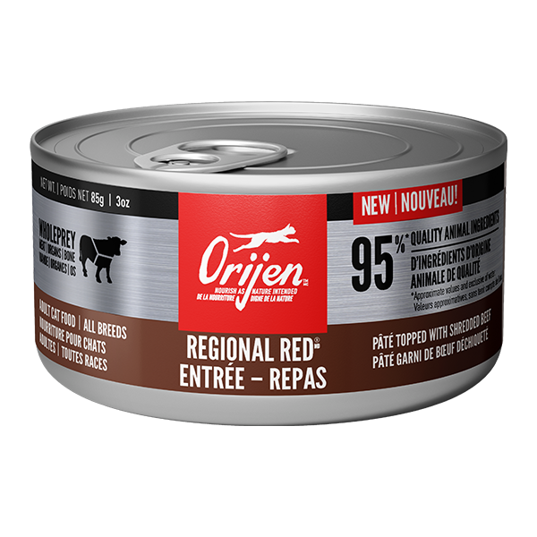 NEW ORIJEN® Wet Cat Food is a super premium pâté packed with WholePrey animal ingredients. ORIJEN® Regional Red Entrée includes raw WholePrey ingredients like meat, organs and bone that provide the protein, nutrients and minerals your cat needs to be their best. At least the first 5 ingredients in every ORIJEN diet are fresh or raw animal ingredients, and the first 10 ingredients in this wet cat food diet are fresh or raw lamb, beef, poultry and fish ingredients. Packed with 95%1 animal ingredients and no peas, lentils, legumes, carrageenan or gums, ORIJEN Wet Cat Food provides the nourishment your cat needs to thrive.